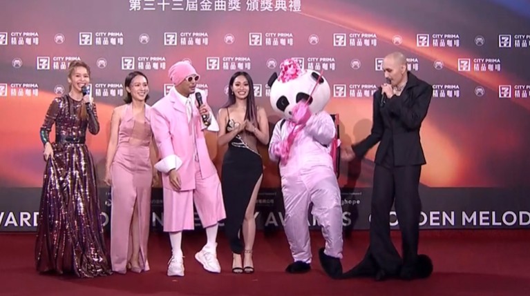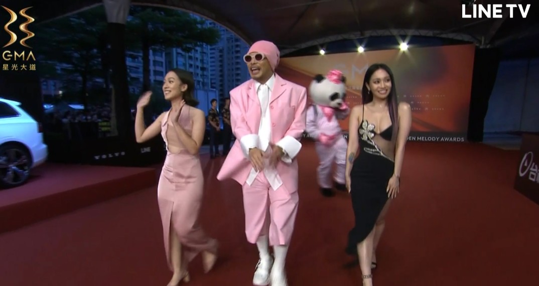 陳芳語身穿黑色禮服,腰部薄紗的中空設計露出小蠻腰,裙擺的開叉設計更是一路開到大腿根部,相當性感!黃明志則是身穿成套的粉紅色禮服,還帶上〈玻璃心〉的吉祥物熊貓,看上去相當可愛活潑!