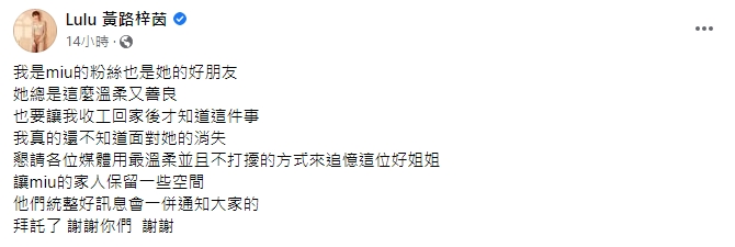 Lulu在臉書發文表示,「我是Miu的粉絲也是她的好朋友,她總是這麼溫柔又善良,也要讓我收工回家後才知道這件事」,甚至不知道該怎麼面對,身為好朋友的她,也希望大家能夠「用最溫柔並且不打擾的方式來追憶這位好姐姐,讓Miu的家人保留一些空間,他們統整好訊息會一併通知大家的,拜託了,謝謝你們,謝謝!」
