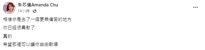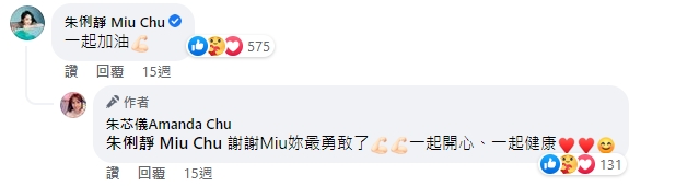 不僅如此,身為乳癌病友的朱芯儀,在今年3月分享了化療日常,朱俐靜則在留言區表示,「一起加油!」她也回覆,「謝謝Miu!妳最勇敢了!一起開心、一起健康」,互相鼓勵著彼此,沒想到三個月後竟得知此消息,讓朱芯儀難過表示,「相信妳是去了一個更無痛苦的地方,妳已經很勇敢了,真的!希望那裡可以讓你自由歌唱」,讓眾人看了相當不捨。