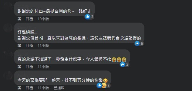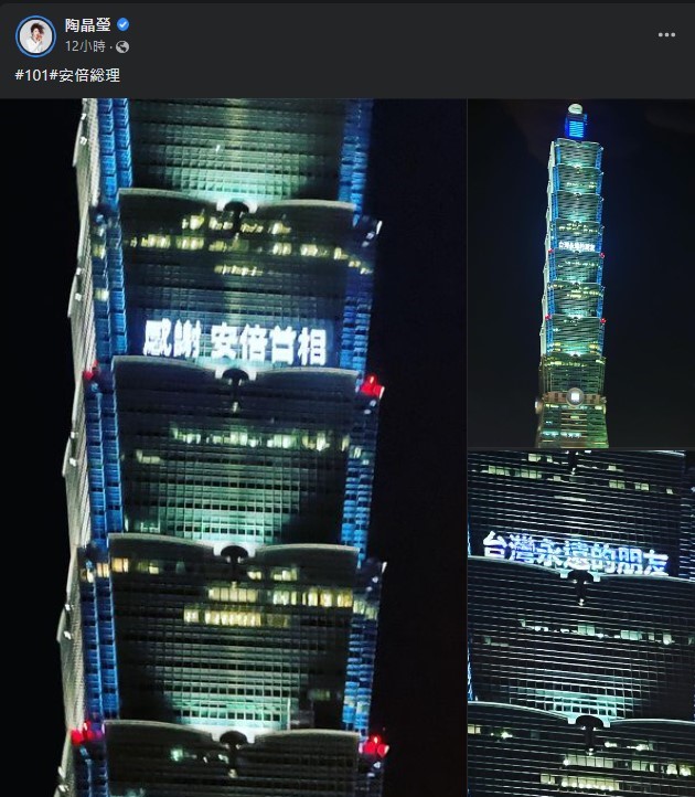 陶晶瑩昨天在臉書PO出台北101的外牆,只見上方大大的出現了「感謝安倍首相」、「台灣永遠的朋友」等字樣,原來是在為前日本首相的死亡哀悼,雖說陶晶瑩在文中並未寫下文案,只標注101及安倍總理,但傳達的哀痛之情不言而喻,網友也相當震驚的表示,「真的永遠不知道下一秒發生什麼事,令人錯愕不捨」、「好難過喔,這份友誼我們會永遠記得的!」、「今天的哀傷蔓延一整天」。