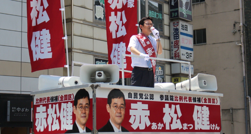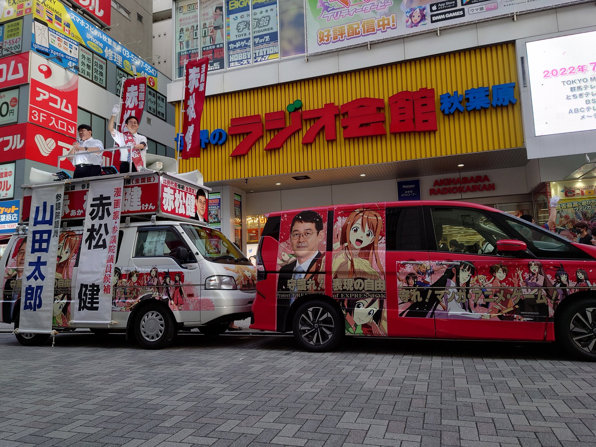 其實,赤松健參選以來的理念便是基於捍衛「漫畫表現自由」,其餘的政見則是「著作權法的完善」、「海賊版的對策」。有趣的是,赤松健在備戰選舉時也是話題不斷,他不但派出選舉「痛車」(ACG文化,以彩繪、黏貼等方式裝飾車輛車身)在街頭宣傳,甚至在遊戲和動漫的聖地「秋葉原」設置個人競選辦公室「赤松健事務所」,不過之前曾因為辦公室招牌、外觀貼滿漫畫插圖,被網友笑稱像「風俗店」!如今順利當選,外界都相當期待他未來的表現。