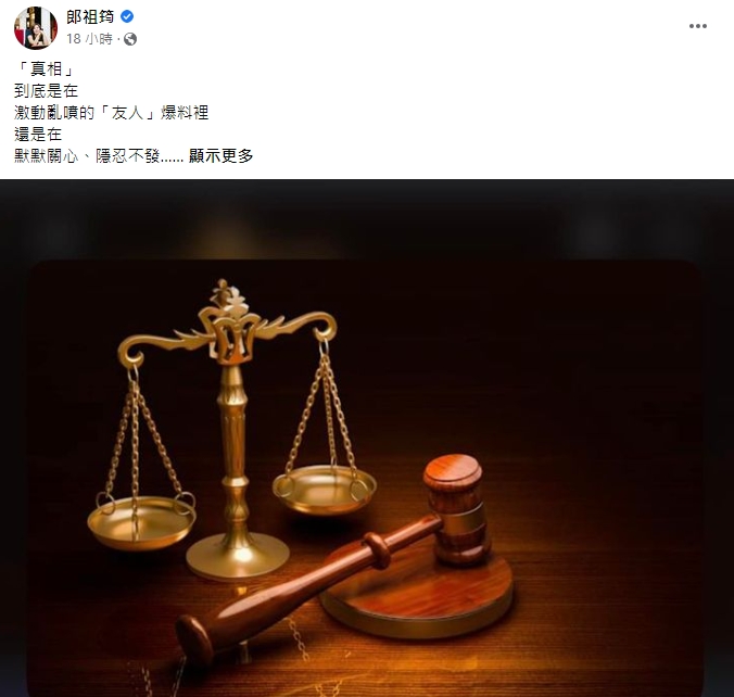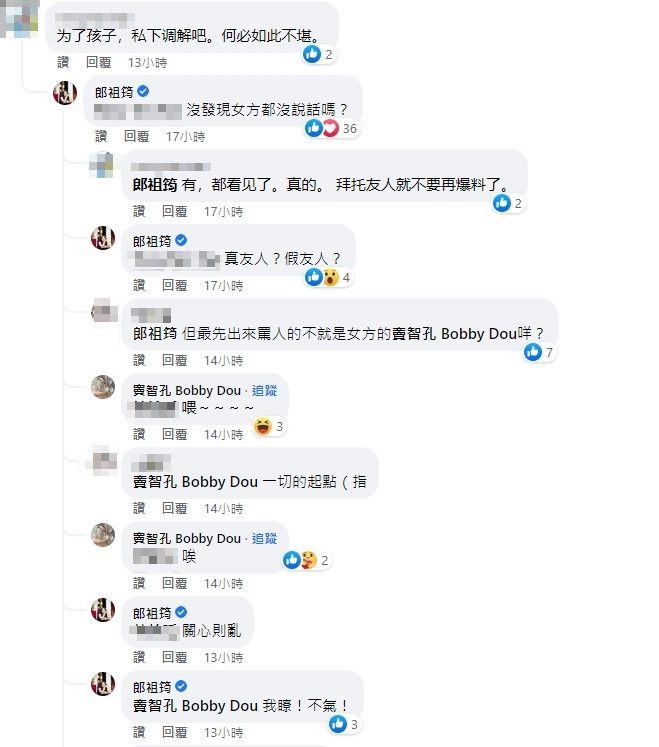 貼文曝光後,引起廣大網友們的討論,像有人就認為「為了孩子,私下調解吧。何必如此不堪?」郎祖筠看見後無奈表示,「沒發現女方都沒說話嗎?」也有人指出,起初最先跳出來發聲的就是女方友人竇智孔,而他看見留言後,僅用「唉!」表達自己的心聲,感覺有話卻不能說,郎祖筠則再度回覆「我瞭!不氣!」似乎還有許多內幕未被爆出。