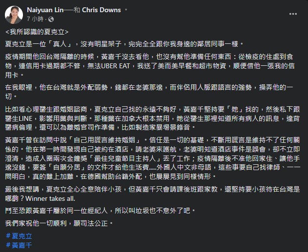 此外,先前有一名自稱是夏克立友人的網友在網路上列出「5大罪狀」控訴黃嘉千,其中包含女方「製造家暴錄音」,但知情者透露,黃嘉千才是長期受到暴力的人,去年8月也有人目擊她帶傷現身醫院,與爆料者的說詞有些出入,而身邊友人都知情。