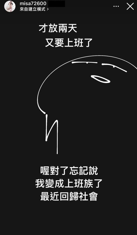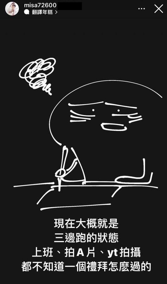 米砂11日透過IG發文表示,「才放兩天又要上班」,由於在大家的認知中,她身為網紅、AV製片,休息時間較為彈性,所以她接著解釋,「喔對了忘記說,我變成上班族了,最近回歸社會」,讓一大票網友們都感到相當驚訝!她解釋目前的工作狀況就是「上班、拍A片、YT拍攝」,一個禮拜的行程超級滿,讓她累到黑眼圈都變得更嚴重了!