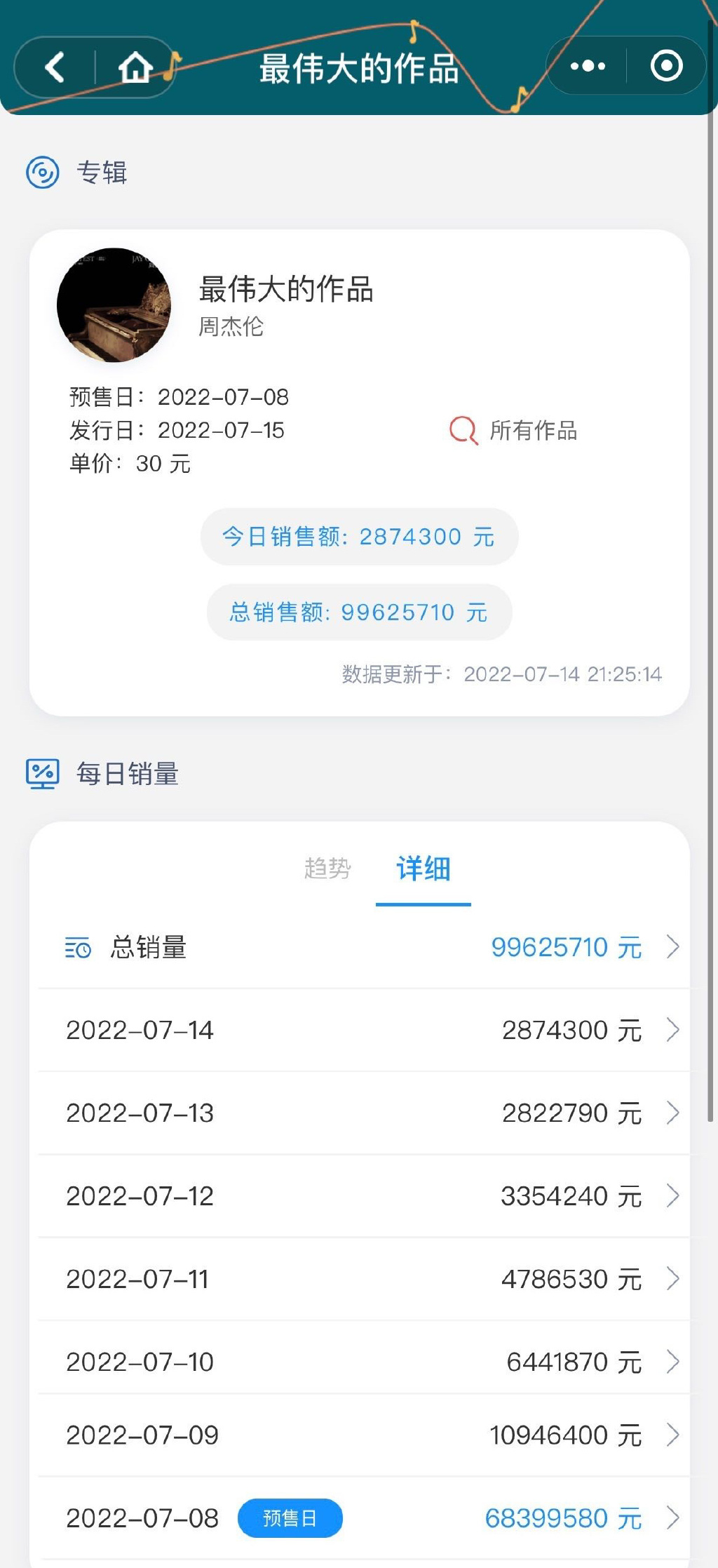 歌手周杰倫睽違六年推出全新專輯《最偉大的作品》,日前搶先釋出的同名歌曲就獲得了不少好評,專輯也在15日於各大音樂平台上線,立刻掀起各界搶聽!而專輯自8日開放預購,光是在中國的音樂平台上,短短七天的銷售額竟高達人民幣1億元(約新台幣4.5億元),立刻掀起網友熱烈討論!