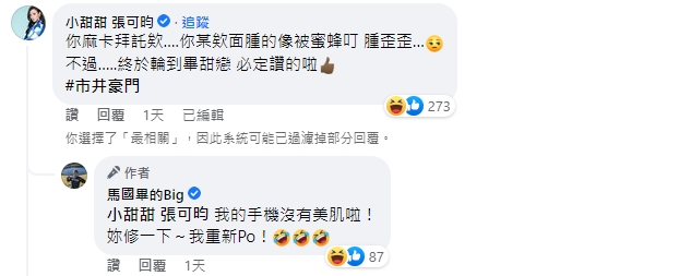 引人注意的是,小甜甜婚前狠甩近40公斤,苗條的身材讓人驚呆,只不過隨著生產過後,體態卻漸漸回不去,先前的V字瓜子臉消失的無影無蹤,取而代之的是圓潤的臉型,她也在留言區自嘲,「你也拜託…你老婆臉腫的像被蜜蜂叮,腫歪歪~」馬國畢則笑回,「我的手機沒有美肌啦!妳修一下~我重新Po!」兩人有趣的互動笑翻一票網友,小甜甜大方的態度再度圈下不少粉絲的心。