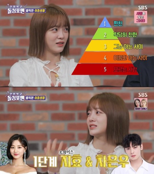 沒想到,金世正更是直接地公開了排行榜上的名單,她先是舉例近期合作拍攝《今日的網漫》的崔丹尼爾、南潤壽,以及節目班底李常敏是第三階,接著第二階則是曾一起活動的成員,I.O.I及gugudan,第一階則是TWICE志效和ASTRO車銀優。