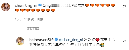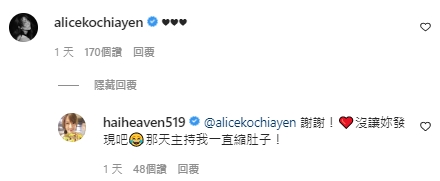 事實上,海芬公布喜訊前,生活依然過得十分忙碌,在工作場合中還與陳庭妮、柯佳嬿見過面,她在回覆留言時還笑說:「謝謝妮~那天主持我還特別先不吃早餐和午餐,以免肚子太凸」、「謝謝!沒讓妳發現吧?那天主持我一直縮肚子!」纖細的身材完全看不出來是個孕媽咪!