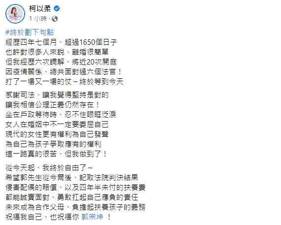 最後,柯以柔還向前夫郭宗坤喊話,「希望郭先生從今爾後記取法院判決結果、侵害配偶的賠償,以及四年半未付的扶養費,都能誠實面對、勇敢扛起自己應負的責任」,並希望未來能夠成為「合作父母」,負擔起孩子的責任,也不忘祝福彼此都能過得更好。貼文曝光後,許多網友都紛紛獻上祝福,希望她的「新生活」能夠越來越順利!
