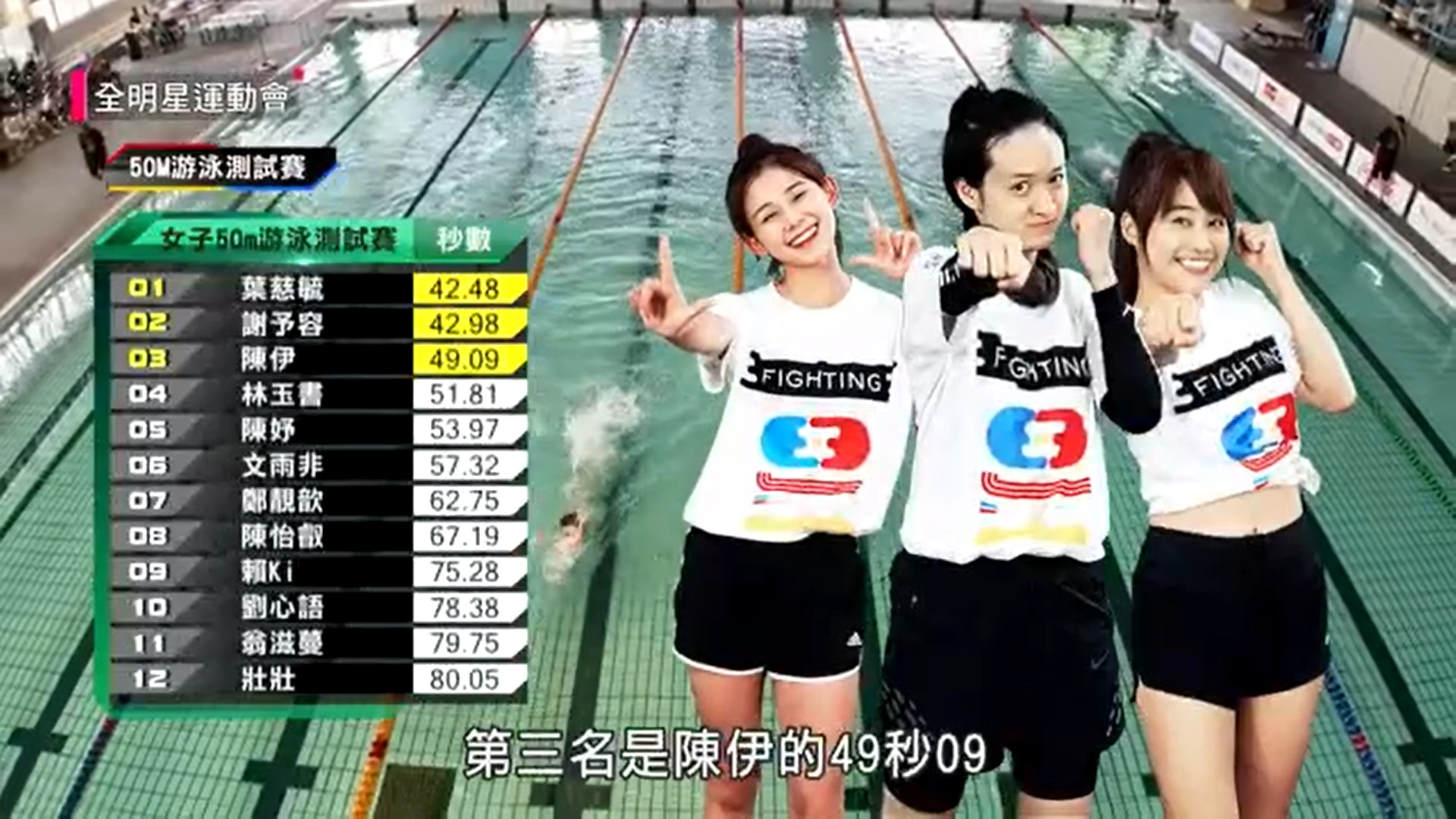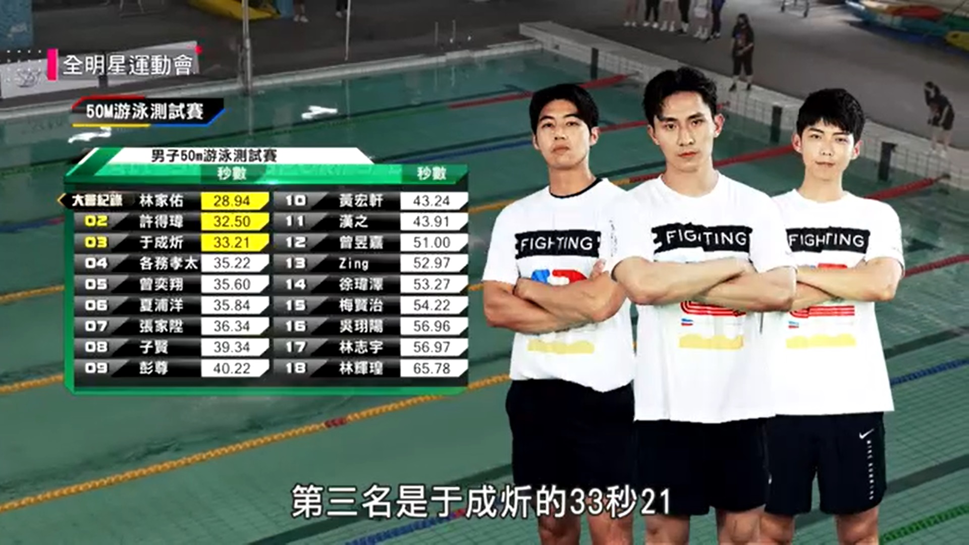 在游泳50公尺頒獎時,葉慈毓表示已經知道不太可能超越第一名的林穎樂,「但是目標就是自己」,更謙虛認為還有很多地方要加油,還放話如果還有機會,「大家就要多注意囉!」林家佑則表示:「我還沒游過這麼快」,坦言今天狀態不好,所以一開始很緊張,最後也謝謝《全明星》的信任,其他人聽聞後也立刻獻上歡呼跟掌聲,感覺得出來大家的互動十分有愛!