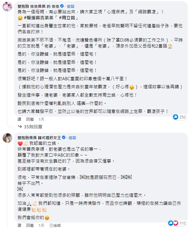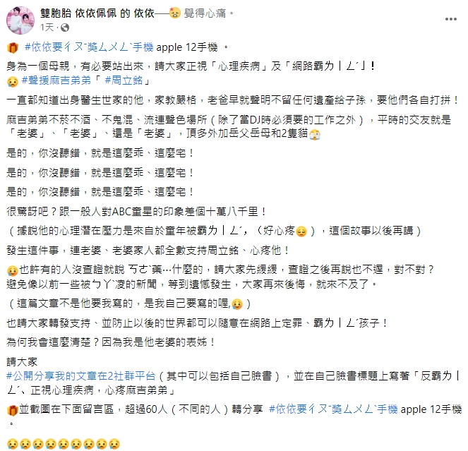 在事情發生後,家人們都感到很心疼,但也很支持他!不僅如此,依依還爆出周立銘的心理潛在壓力是來自於童年被霸凌,因此希望大家能夠先查證再說話,藉此杜絕網路霸凌!最後,她強調是自願發文力挺,並解釋自己其實是他老婆的表姊,所以才會如此了解狀況。