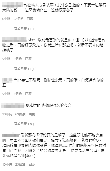 隨著貼文在網路上瘋傳,部分中國網友認為她是在表明「台獨」立場,並大量湧入她的微博、IG出言訓斥,「以後在你的臺灣好好待著吧,反正不歡迎你了」、「台獨就大方承認嘛,沒什麼丟臉的。不要一邊賺著大陸的錢,一邊又偷偷台獨」、「以後千萬別來大陸宣傳、賺錢哦~」