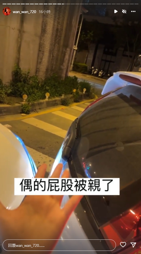 宛宛兒3日深夜在IG發文透露衰遇「車關」,原來是自己開車到一半,遭到後方汽車追撞,只見影片中,她駕駛的汽車被後方的白色轎車擦撞到車屁股,所幸車速不快,除了車身擦傷外,人沒有大礙,雖然平安無事,但她的心情不免受到影響,語氣中透露出滿滿的無奈。