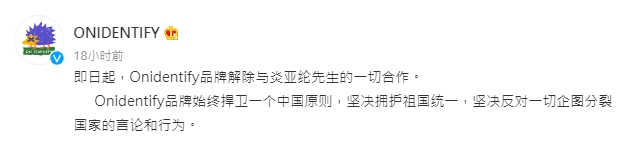 隨著輿論聲浪越演越烈,炎亞綸在2021年成立的服飾品牌「ONIDENTIFY」的官方微博4日竟大動作發文切割,「即日起,Onidentify品牌解除與炎亞綸先生的一切合作。Onidentify品牌始終捍衛一個中國原則,堅決擁護祖國統一,堅決反對一切企圖分裂國家的言論和行為。」讓所有人全都看傻眼!