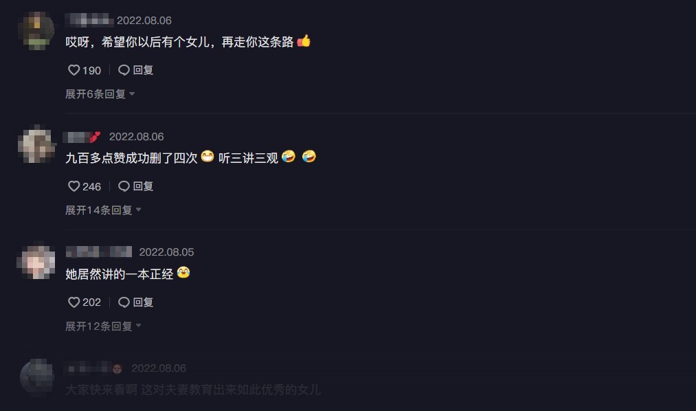 不過不少網友看到影片後,仍不看好她的說詞,紛紛留言開酸:「媽呀!開始賣父母的愛情了」、「爸爸覺得在家躺著也中槍」、「小三教大家如何樹立正確的三觀」、「妳的內心會充滿力量,充滿當小三的力量」、「三兒教大家三觀,背地做著見不得人的勾當」、「媽呀,這三真是內心夠強大的」。