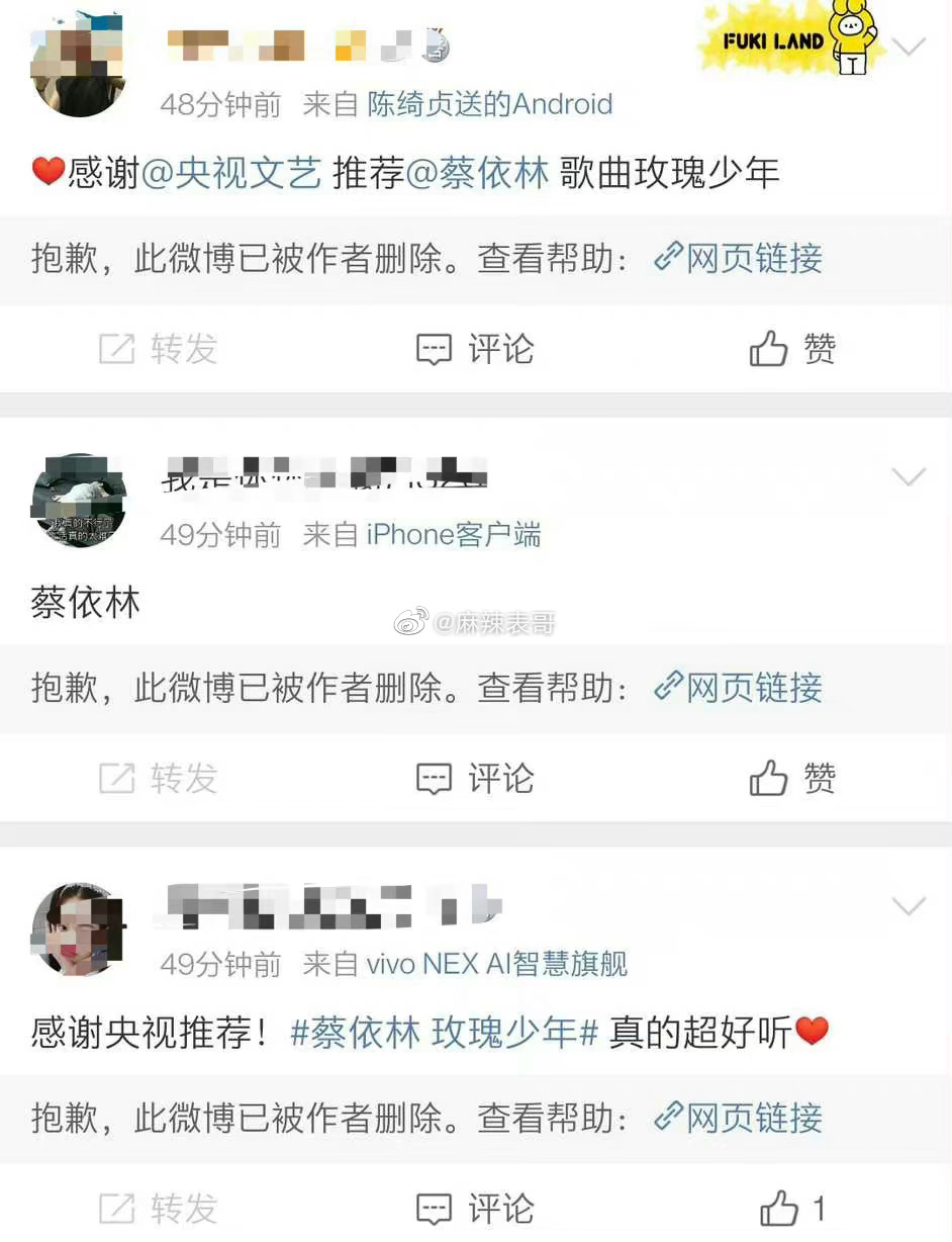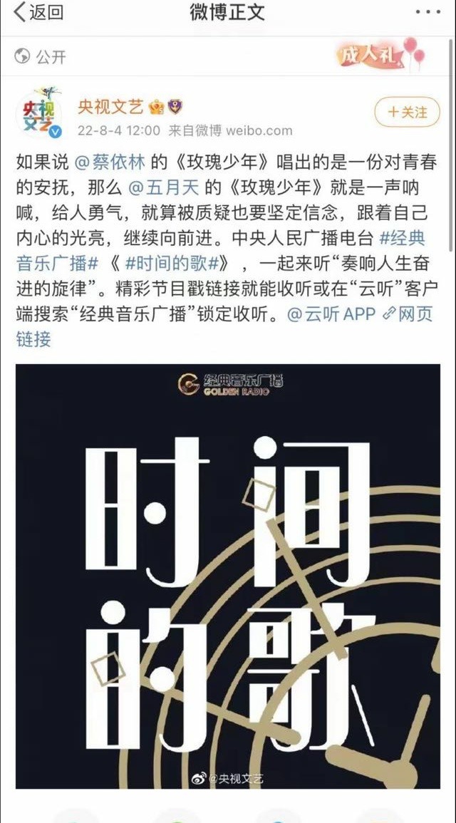 央視文藝的官方微博在4日PO出有關蔡依林的貼文,大讚〈玫瑰少年〉唱的「是一份對青春的安撫」,許多粉絲透過轉發表達支持,只不過隨後便被網友發現,該貼文已經迅速下架,許多人認為是與蔡依林未表態「一個中國」立場,再加上央視是官媒,為了避免紛爭才火速刪除。