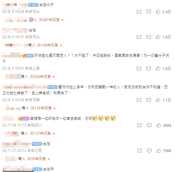 此次裴洛西訪台掀起了中國強烈的不滿,許多藝人大展愛國之心,紛紛表態「一個中國」的立場,其中還包含許多台灣藝人,包含楊丞琳、王大陸、劉畊宏、王心凌、張鈞甯、陳喬恩、潘瑋柏等人,但田馥甄、炎亞綸卻因為吃義大利麵、提及台、美式早餐,而被貼上「台獨」標籤,微博上甚至還有「未表態名單」,再度引發熱議。