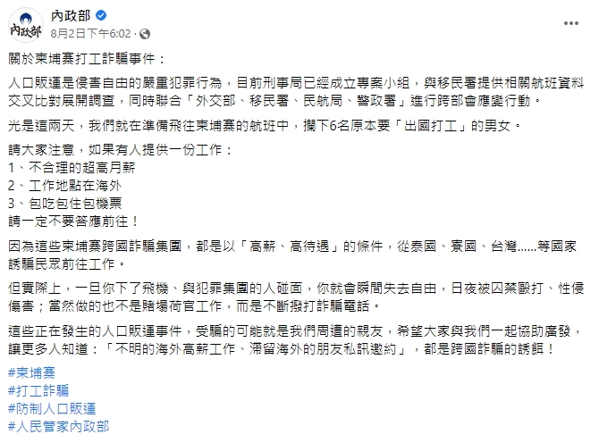 更可怕的是,根據知情人士指出,如果以近半年有5000名台灣人到柬埔寨做假設,扣除一成的人有回國,再加上有收到家長求助的部分,推測至少還有高達2000名台灣人在當地受到控制。對此,內政部還透過臉書專頁進行宣導,希望不要再有更多人受害!