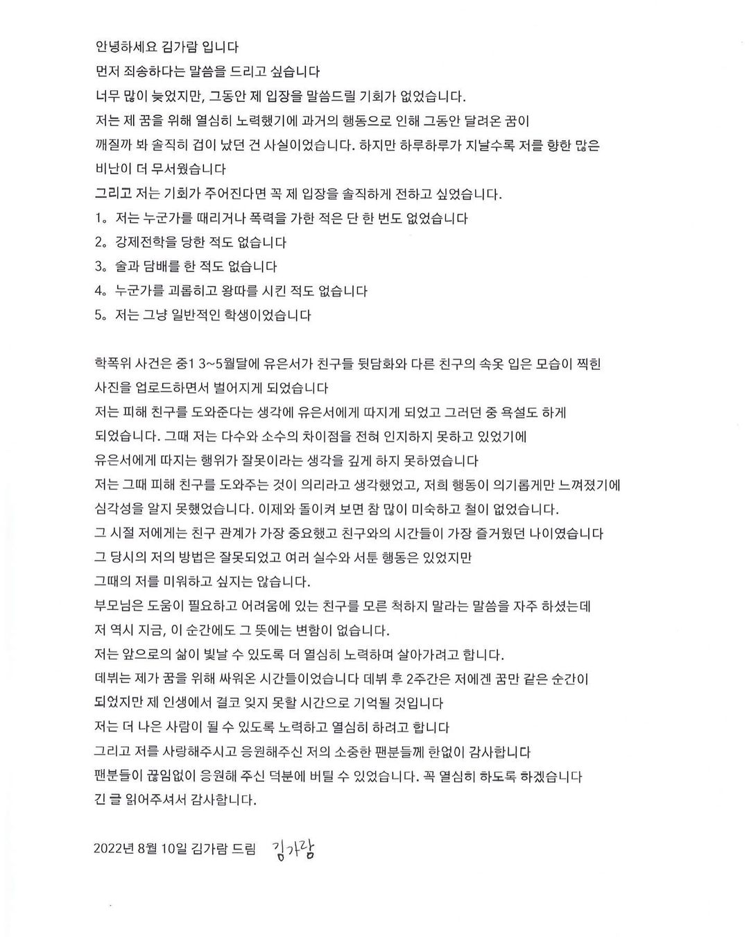 金佳藍也強調,當時只在乎朋友的關係以及義氣,並沒有想到其嚴重性,「現在想起來,真的很不成熟也不懂事!」儘管坦言自己當時的方法不正確,但她也並不想去討厭責怪當時的自己,「父母親經常說要幫助,不要對有困難的朋友裝不認識,我到現在此刻也沒有改變過這個想法」。最後金佳藍也對於「短暫」的出道表達感激,並且也向粉絲致謝。