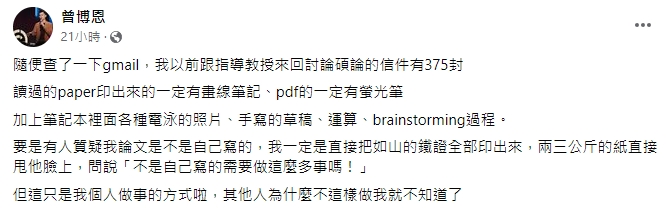擁有雙碩士學位的博恩,在11日透過臉書發文,提到學生時期寫論文的經驗,他表示,「我以前跟指導教授來回討論碩論的信件有375封」,撇除信件以外,紙本文獻一定會畫線筆記,電子檔會用螢光筆作記號,再加上筆記本裡的照片、手寫草稿、運算過程等,總共累積了不少「筆跡」。