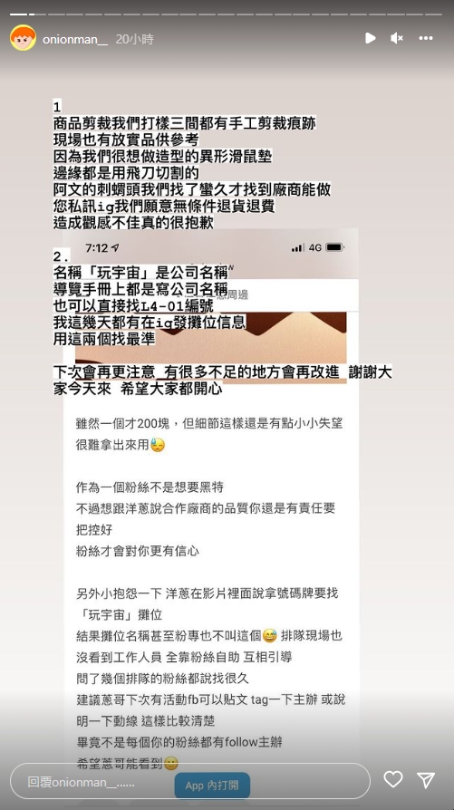 至於攤位名稱的問題,洋蔥解釋「玩宇宙」是公司名稱,自己這幾天也都有在透過IG發攤位訊息及編號,因此用這兩個資訊找攤位會最準確,對於這次造成的問題,他也表示,「下次會再更注意,有很多不足的地方會再改進!」對此,網友們都認為洋蔥無論是在商品還是與粉絲的互動都是「誠意滿滿」,處理事情的方式也很好,建議原PO下次可以直接私訊洋蔥本人會更好!
