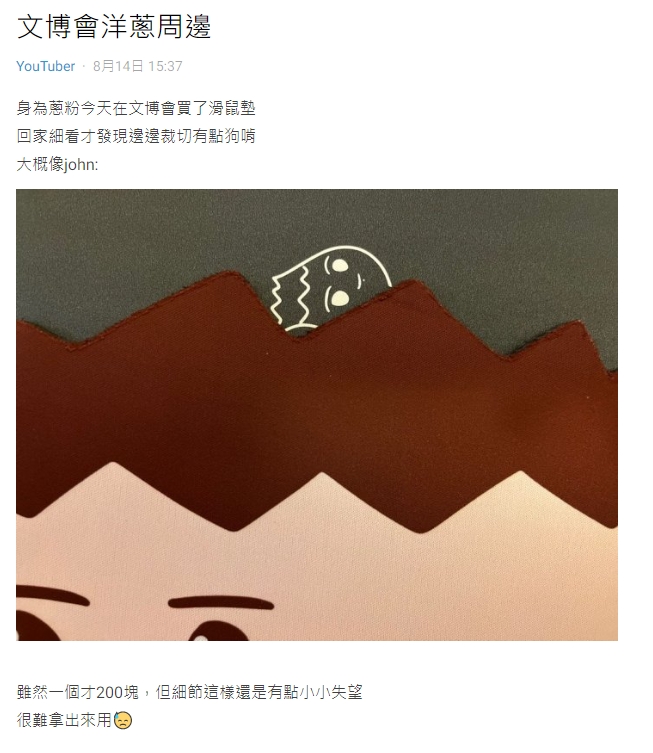 有網友在Dcard發文表示,最近到文博會逛展,並花了200元購買洋蔥出的滑鼠墊,只不過滑鼠墊的裁切細節不太工整,讓原PO直呼,「有點小小失望,很難拿出來用」,但他也解釋自己作為粉絲不是想要引戰,而是認為「合作廠商的品質你還是有責任要把控好,粉絲才會對你更有信心!」不僅如此,原PO也指出,洋蔥曾在影片中提到「拿號碼牌要找『玩宇宙』攤位」,結果到了現場才發現攤位名稱有誤,全靠粉絲互相協助才找到正確的地方。