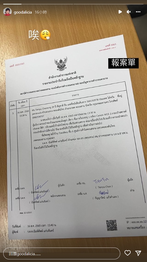 愛莉莎莎14日抵達泰國後,接連分享了美食跟美景,在旅遊的同時還拍攝了最貴飯店系列的影片,超奢華的享受讓她開心直呼,「開心到變狐狸了~努力拍拍中,要期待唷!」感覺得出來此趟旅遊的心情真的相當好!怎料,她在發文隔天竟突然在IG限時動態曬出「報案單」,更意外曝光了本名「TienYu Chen」。