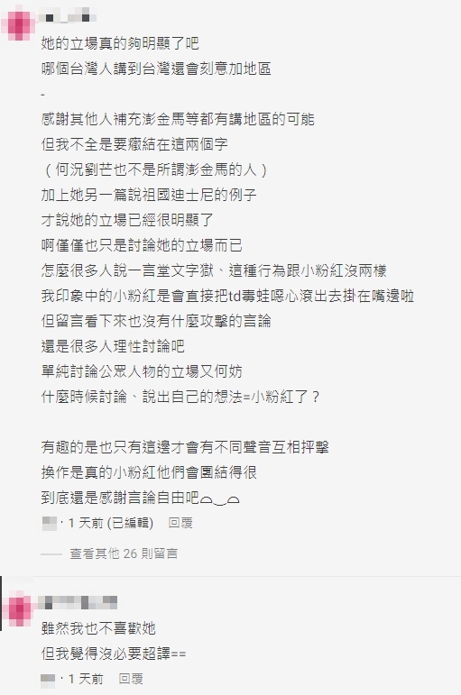對此,有網友認為除了離島的居民,普遍大眾並不會在國家名字後面加上「地區」這兩個字,再加上劉芒過去就曾有發文使用「祖國」的先例,因此才會認為她的立場明顯!但也有另一派人持反方意見,認為「祖國」用詞有可能是與朋友私底下打鬧的用語,何況當時她還只是一般的上班族,沒有必要「抱大腿」,而「地區」的用法也沒有這麼嚴重,不應該過度解釋,甚至還過分到把網路霸凌包裝成言論自由。