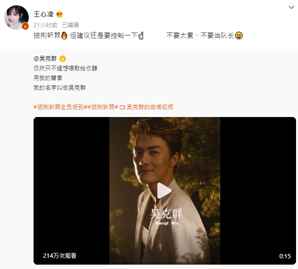 不僅如此,在《披荊斬棘》公開參賽名單時,王心凌就曾在微博轉發吳克群、信、潘瑋柏的貼文,並以過來的人的經驗分別喊話,「披荊斬棘!但建議還是要控制一下~不要太累、不要當隊長」、「信哥,相信我,可能不只兩三個月喔!」、「I’m ready!期待!」展現出好感情!