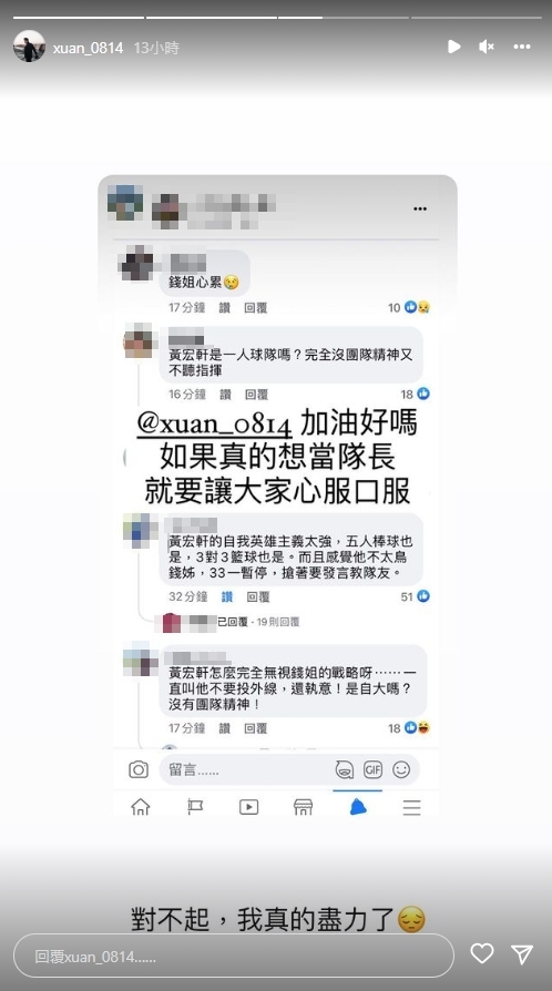 事後,藍隊在賽場上的表現也引起了網友的不滿,認為成員的自我意識太強烈,很沒有團結的感覺,並點名黃宏軒「無視錢薇娟的指導」。對此,他也透過IG發文道歉,「對不起,我盡力了」,他表示賽前就知道這場比賽會非常劣勢,但很謝謝隊友們即使了解這一點還是很努力奮鬥,也謝謝網友們的指教,「不論是鼓勵或是指責我們都會吸收」,並希望下一次能夠讓大家看到更精采的比賽!