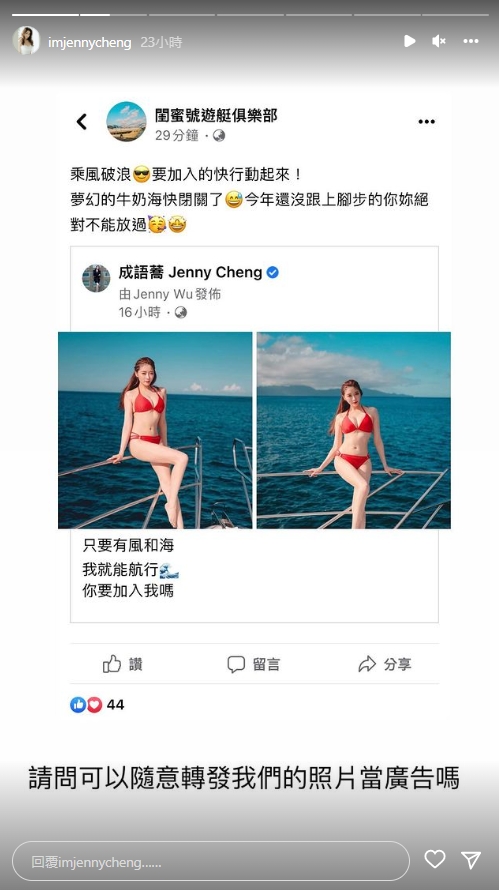 藝人成語蕎憑著亮眼的外型、優異的口條深受粉絲的歡迎,即使工作忙碌,她還是經常透過社群平台與網友分享生活點滴,像是日前她參加好友楊晨熙的生日遊艇派對,事後還大方曬出美照,只不過她的照片在沒有經過同意的情況下,就被遊艇公司轉發當宣傳廣告,加上對方當天服務不周,讓她氣到直接與店家槓上,掀起網友高度關注!