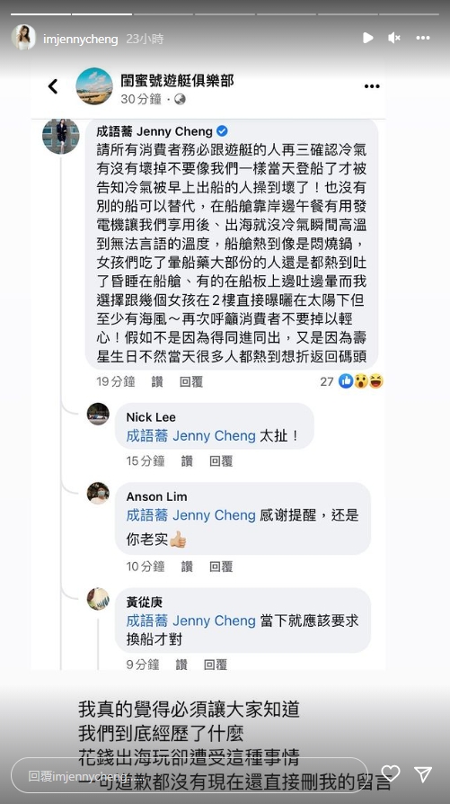 出海開趴「遊艇冷氣壞掉熱到狂吐」!成語蕎留言被刪氣炸怒槓店家:必須讓大家知道我們經歷什麼