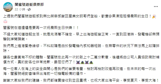 對此,遊艇公司也親上火線解釋,「早上出海遊艇皆正常,一直到回港時,發電機卻無預警跳掉鬧脾氣。我們馬上進港緊急維修,不料故障是由於發電機內感知器短路,在無零件的狀況下無法馬上故障排除」,讓客人有不好的體驗感到很抱歉,後續將與客人進行協商補償方案。