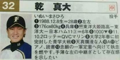 事實上,乾 真大在職棒沙場上征戰超過10年的時間,2010年在日職選秀會上被火腿鬥士以第三指名選中,隔年10月2日初登板,為火腿效力5年後,他在2016年被交易至讀賣巨人,2017年遭球隊宣告為戰力外,乾 真大7年的日職生涯表現並不出色,總計出賽74場,拿下1勝2敗,平均防禦率5.65。