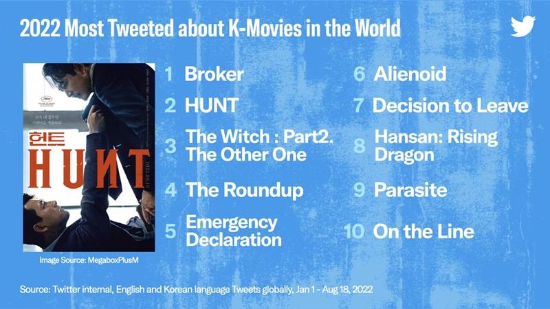 電影部分則依序是,《嬰兒轉運站》、《獵首密令》、《魔女二部曲:另一個她》、《犯罪都市2》、《緊急迫降》、《外星+人》、《分手的決心》、《韓山島海戰》、《寄生上流》以及《攔截聲命線》。