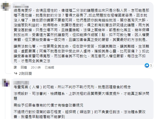 貼文曝光後,獲得廣大網友們的支持,「不能只有加害者有人權,被害者受害家屬也要有人權!」、「我支持死刑,但嫌犯的犯案動機跟心理狀況需要研究!」,掀起網友們的熱烈討論!