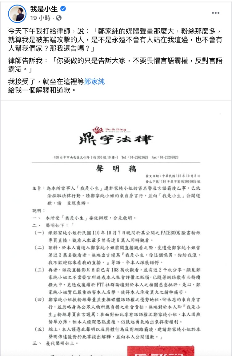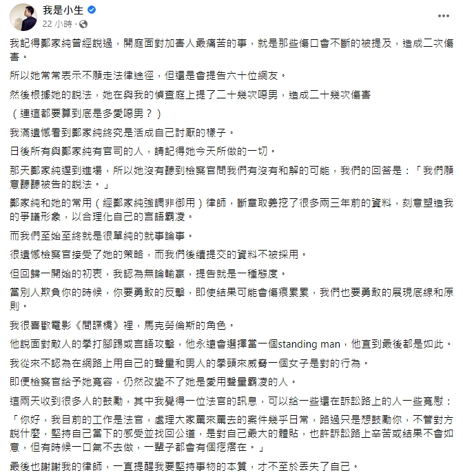 對於鄭家純的行為,我是小生認為雖然檢察官給予了寬容,「仍改變不了她是愛用聲量霸凌的人」。最後,我是小生也很感謝大家的關心及安慰,也幸好有律師的幫助,才能讓他堅信自己。