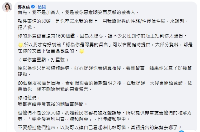 對此,鄭家純不甘示弱的在貼文下方回擊,「我是被你惡意嘲笑而反擊的被害人」,並解釋整件事件的起源是小生用她舉辦過的性騷擾、性侵信件展來嘲諷自己,由於態度太過份,所以有不少女性到小生的社群批評,「所以我才有好幾篇『認為你是噁男的留言』可以在開庭時提供」,一開始就有好心提醒對方刪除留言,沒想到他卻變本加厲多寫了好多文,如今還把一般民眾牽扯進來,讓她氣到怒批,「以為可以讓自己看起來比較可憐,當初提告的氣勢去哪了?」並強調「完全沒有利用官司賺和解金」,自己也陸續和其他人和解中。