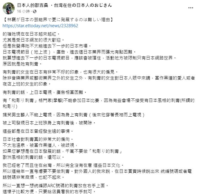 「日本人的歐吉桑」看了林襄深受日本人歡迎的新聞後,最近透過臉書發文寫下對於她要進軍日本的看法,歐吉桑直言,「我覺得她不太能進去下一步的日本市場」,如果想要上電視可能會被阻擋,能夠活動的範圍只有網路世界,「原因就是她有『刺青』,有刺青的女生在日本有非常不好的印象,也有很大的偏見!」除非是音樂家或藝術家,不然很容誤認為是黑道的女人,又或是在特種行業上班的人。