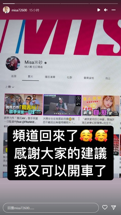 成功救回95萬YouTube頻道!米砂樂喊「又可以開車了」 加碼公佈好消息