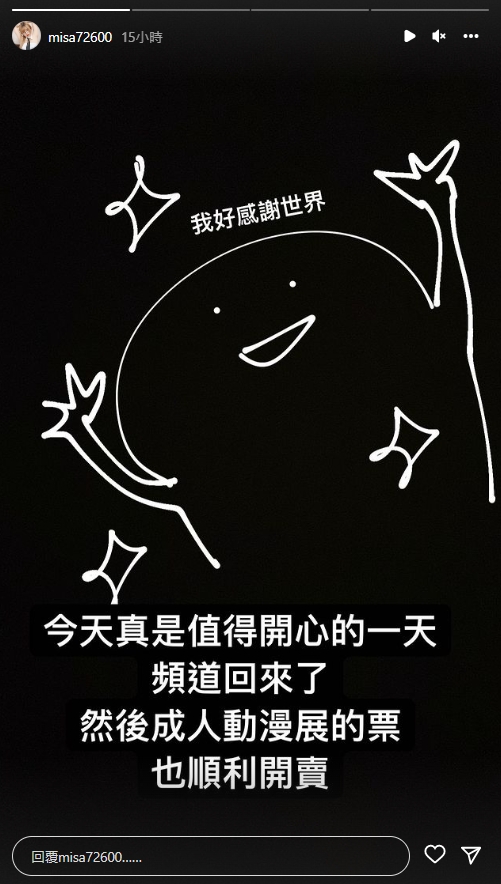 過了一天之後,米砂在2日凌晨分享好消息,「頻道回來了!感謝大家的建議,我又可以開車了~」而且連最新發佈的影片都安然無恙,一部都沒有少!另外,她也表示,籌辦的成人動漫展的票也已經順利開賣,所有煩心事都完美解決,讓她高興直呼,「我好感謝世界!」從她的圖畫中都能夠感受到她的開心!