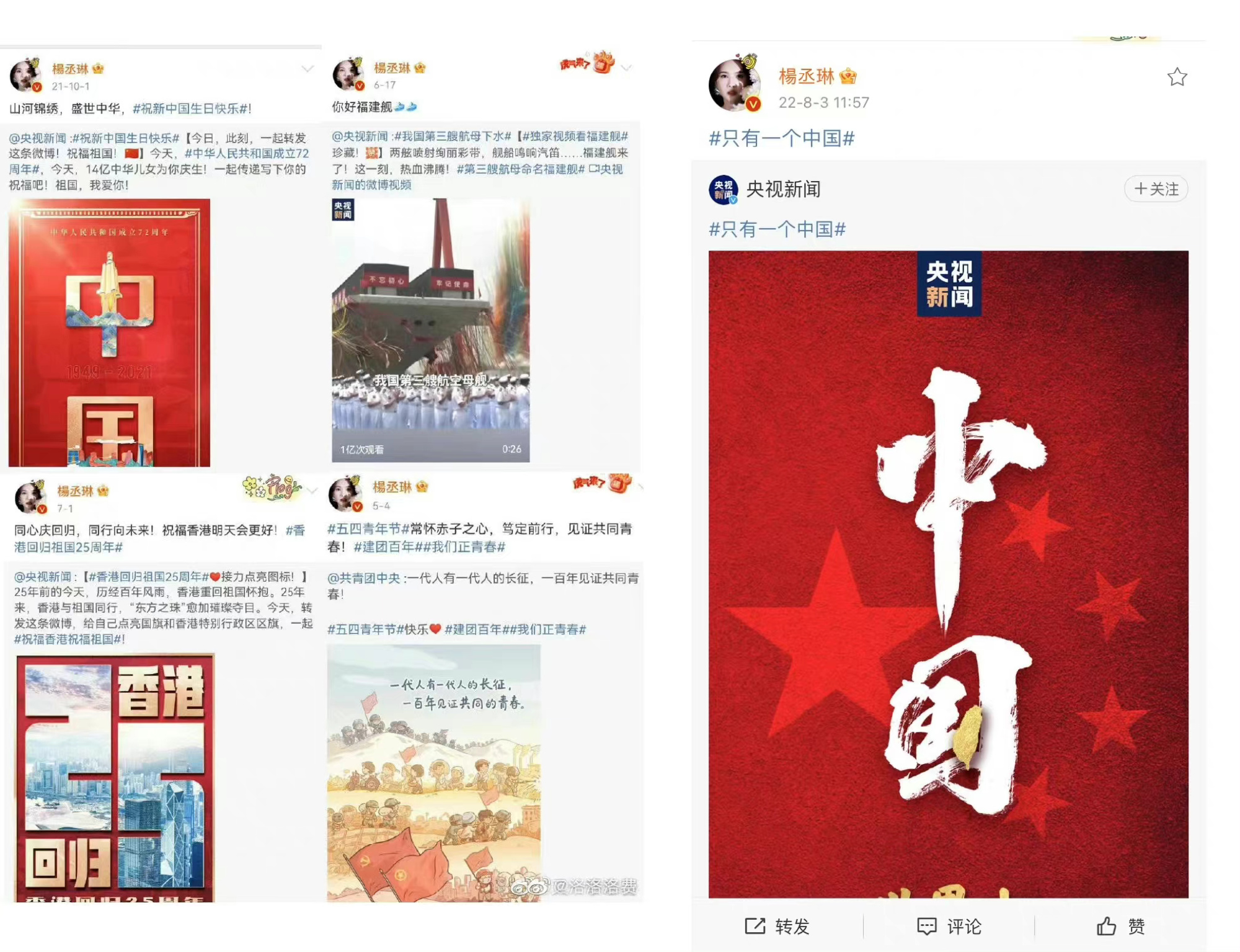 事實上,楊丞琳過去就經常透過微博轉發各種表明政治立場的貼文,從一般的各種節日,再到充滿政治意味的香港回歸中國文、中國國慶,以及前陣子因美國高官訪台而再度掀起討論的「一個中國」話題,她全都跟緊時事,因此鞏固了在中國人民心中的地位,卻讓台灣不少粉絲大失所望!