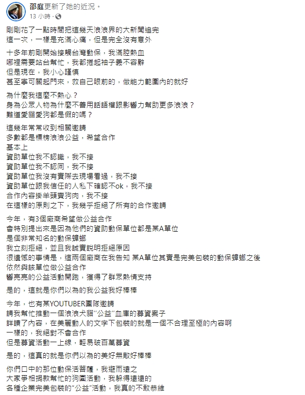 邵庭5日在臉書表示,看完庇護所的新聞後,「一樣是充滿心痛,但是完全沒有意外」,她透露剛開始接觸動保的時候,總是義不容辭,但現在反而變得小心謹慎,只做能力範圍的事情就好,而這幾年經常收到有關流浪動物公益的合作邀請,但是只要不認識、不認同的單位就不會配合,在如此嚴格的把關之下,幾乎拒絕了所有合作邀請。