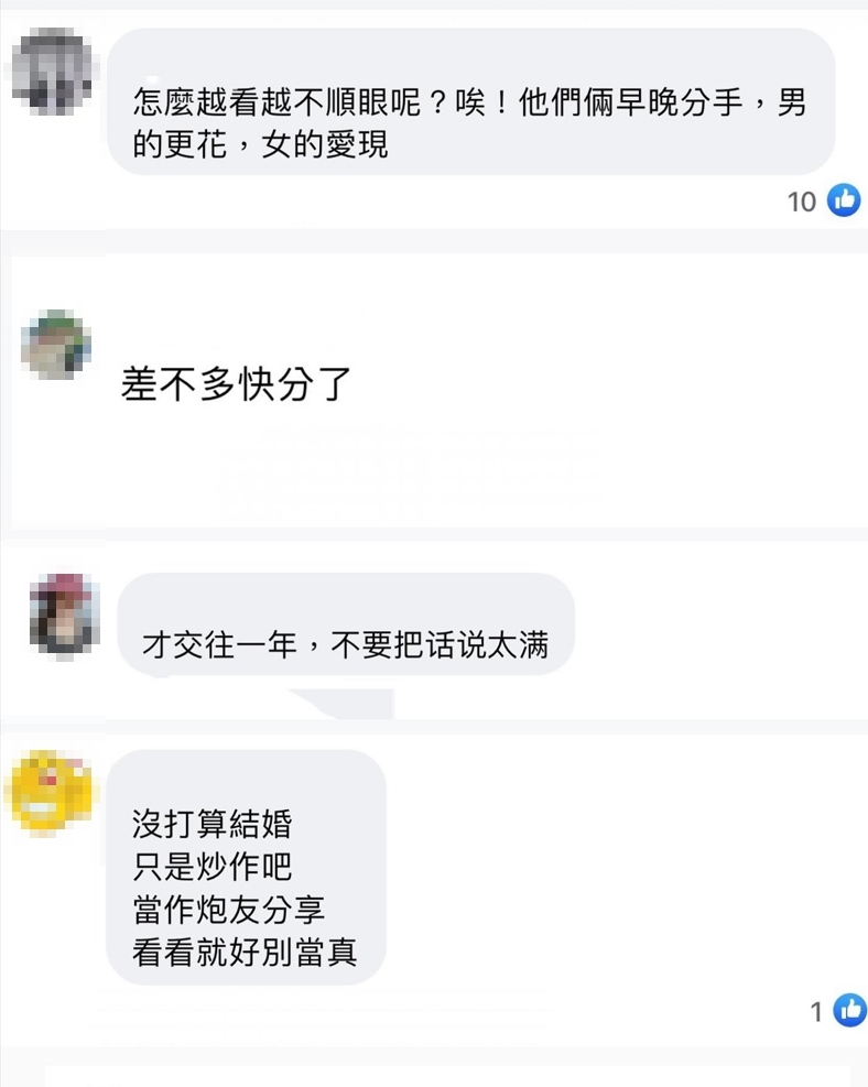 佳娜6日在IG將部分酸民的留言截圖公開,可以看到有網友留言表示,「他們倆早晚分手,男的更花,女的愛現」、「沒打算結婚,只是炒作吧!當作炮友分享,看看就好別當真」、「現在是年輕,等妳生完小孩,我看妳能多年輕,別忘了妳們外國人老的比誰都快喔!」砲火相當猛烈!