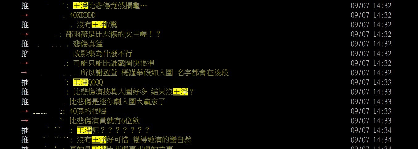 第57屆金鐘獎入圍名單自7日公布之後,立刻在PTT板上掀起討論,有網友直言,「今年真的都很猛,但同時也有好多遺珠」,在演員的入圍名單中《比悲傷更悲傷的故事:影集版》雖然入圍了男、女主角及男、女配角,但身為主演的王淨卻未能入圍,讓不少網友都不敢置信,「王淨比悲傷竟然摃龜」、「王淨沒入圍也太扯」、「王淨沒入圍真的好奇怪」、「王淨呢???????」、「比悲傷王淨沒入圍真的扯...」。