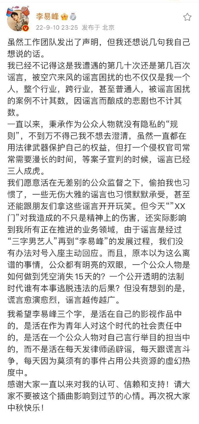 李易峰工作室因此在晚間正式澄清,他本人更是誠懇發文表示,「我已經不記得這是我遭遇的第幾十次還是第幾百次謠言」,不僅反駁外界說法,還強調公眾人物無法憑空消失15天,間接透露自己不可能被拘留,同時也強調,「我希望李易峰三個字...是活在一個公眾人物對自己言行舉目的擔當中的,而不是活在每天發律師函辟謠,跟謊言鬥爭,因莫須有的事件占用公共資源。」
