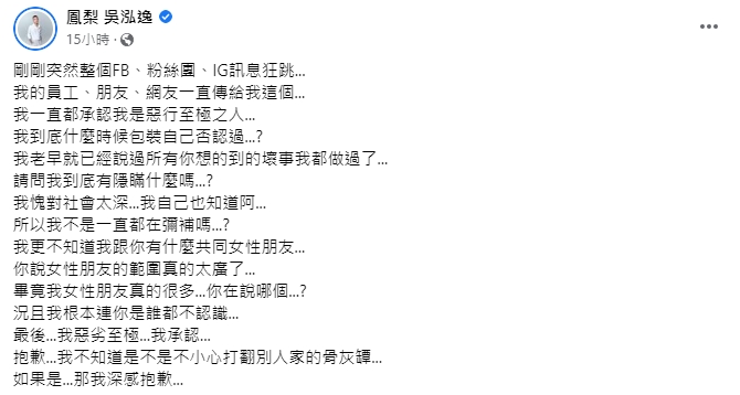 對此,鳳梨13日在臉書無奈表示,「我一直都承認我是惡行至極之人,我到底什麼時候包裝自己,否認過?我老早就已經說過所有你想的到的壞事我都做過了」,對於這些事情從來沒有隱瞞,也明白自己愧對於社會太深,「所以我不是一直都在彌補嗎?」至於網友提到的「共同女性朋友」,他則表示自己的女性朋友不少,況且跟對方根本不認識,完全不曉得網友所指的人是誰。