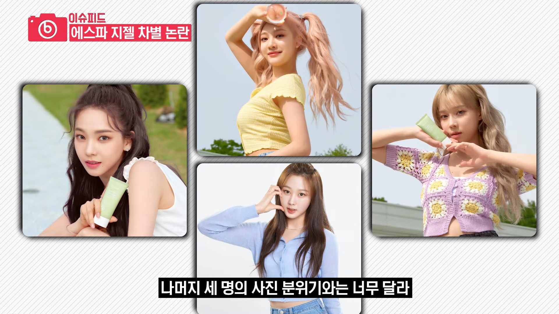 不僅如此,化妝品牌CLIO的代言照也曾發生Giselle的背景與其他3位成員不同的狀況,甚至手上還沒有拿品牌產品!雖然經紀公司曾解釋,是由於Giselle當時無法在室外拍攝,所以才會改以在棚內拍攝,但粉絲仍是認為完全空白的背景與其他成員差異甚大。