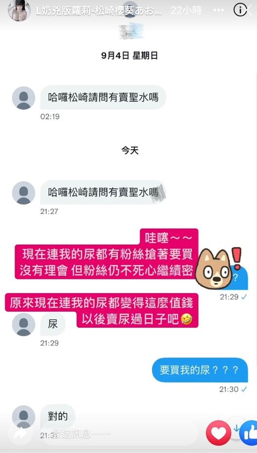 對此,松崎櫻葵表示,「現在連我的尿都有粉絲搶著要買」,雖然一開始沒有理會,但網友仍不死心,繼續以訊息騷擾,雖然感到很無奈,但她還是開玩笑說,「原來現在連我的尿都變得這麼值錢,以後賣尿過日子吧!」逗樂了不少粉絲。