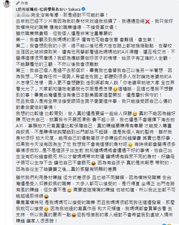 事實上,松崎櫻葵經常拍攝大尺度的寫真,有網友因此好奇是否有考慮當AV女優?對此,她則表示,「完全沒有考慮,那是絕對不可能的事!」並列出了三大原因指出,「第一是顧及媽媽的面子,第二是不希望自己的職業影響到孩子的生活,第三則是自己無法跨出那一步,也不想要未來的另一伴受到指指點點!」她更直言,「真的不能因為錢好賺而迷失自己,就算我今天窮困潦倒養不起小孩,我也還是不會選擇下海去拍A片」,現在只會做好模特兒的本業。